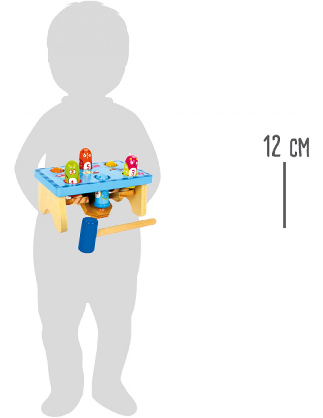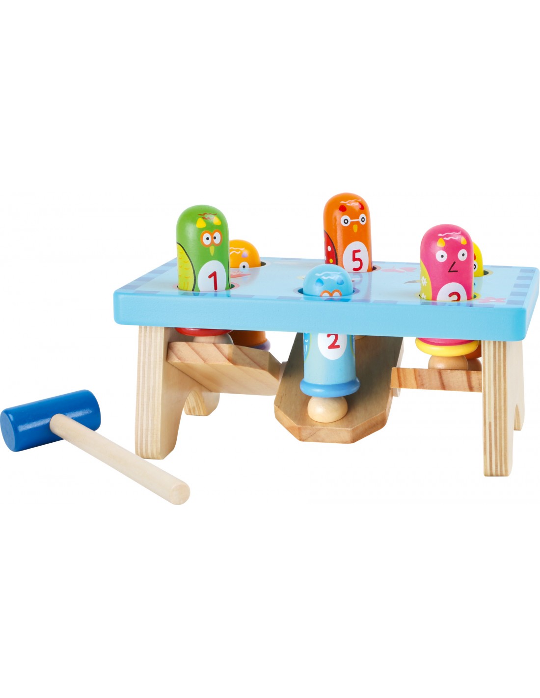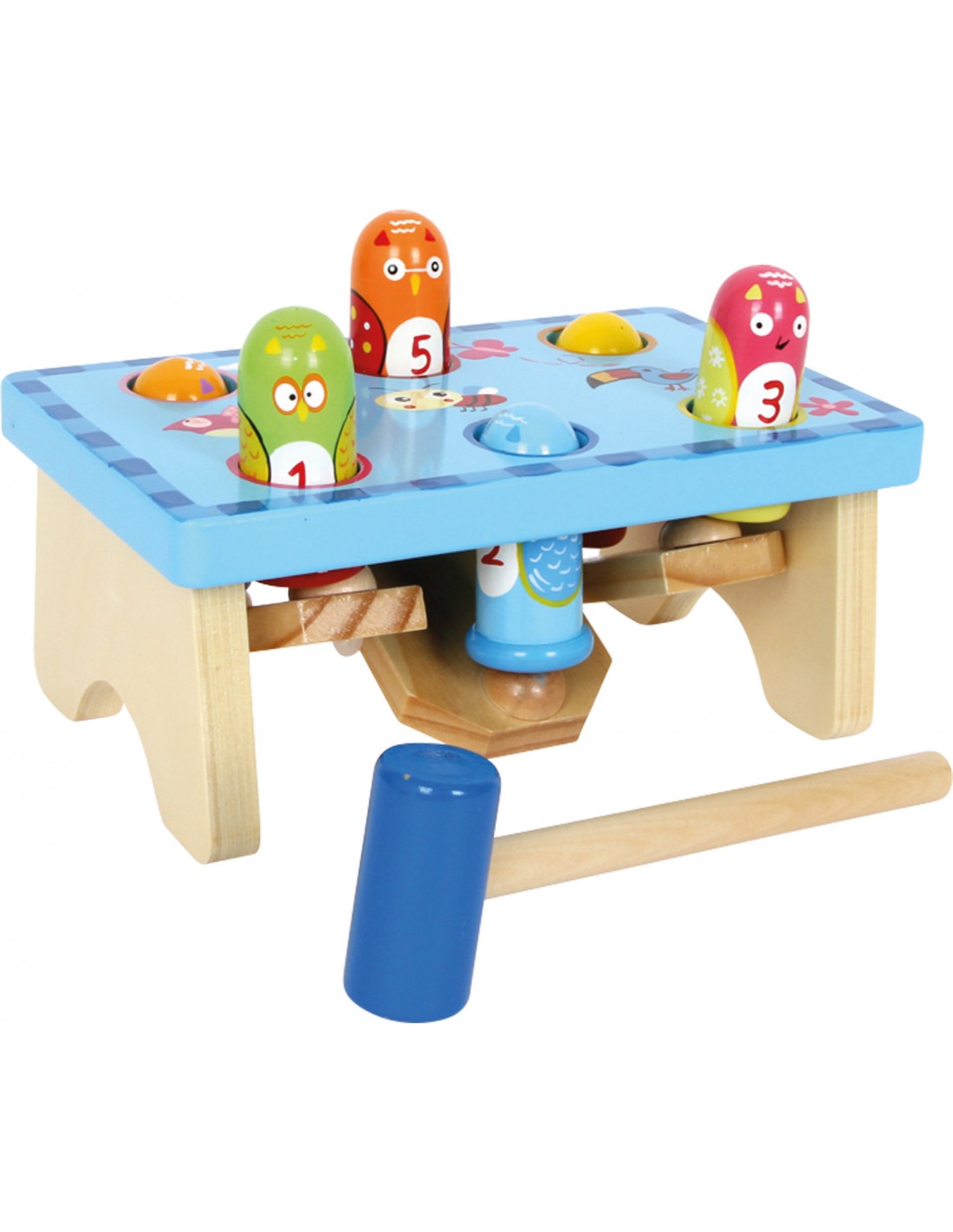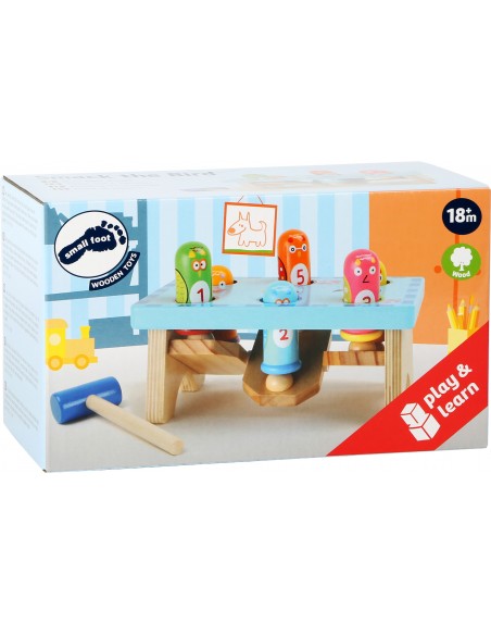 Cuic, cuic! Les 6 jolies oiseaux aux têtes rigolotes montent et descendent à tour de rôle lorsque l'on tape dessus. Dès 1 an, l'enfant peut démontrer ses capacités! En cognant sur un oiseau, un de ses compagnon ressort, invitant toujours à user du marteau.