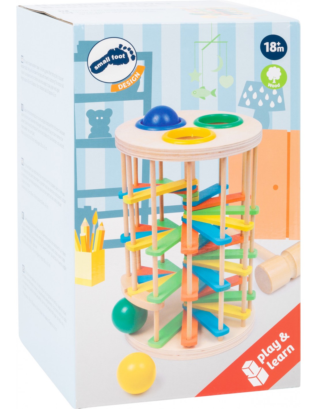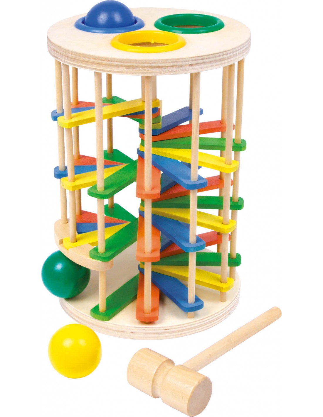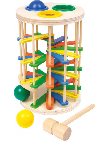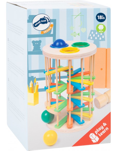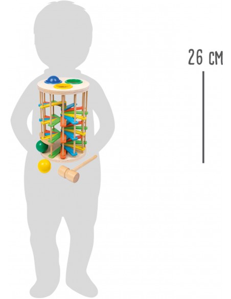 Un jeu amusant avec cette belle tour en bois! Une fois frappées avec le marteau, les 3 boules de bois peint descendent à grande fracas les marches multicolores! La tour de motricité est une réelle expérience pour les tout-petits et les invite à rejouer toujours et encore. Un jeu amusant que cette belle tour en bois ! Une fois frappées avec le marteau, les 3 boules de bois peint (Ø = 4,5 cm) descendent à grande fracas les marches multicolores !